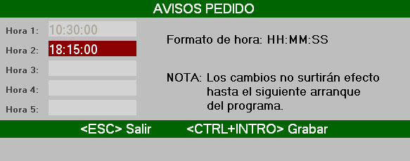 2. Pulse la tecla CTRL+P para acceder a la pantalla de horas de aviso de pedido.